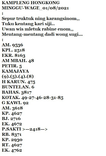 Kode Syair Hk Minggu 1 Agustus 2021 , meliputi forum syair Hongkong , Bocoran hk serta prediksi togel hk dan di lengkapi juga dengan data pengeluaran Hk 2021 .