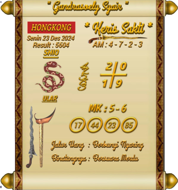 Kode Syair Hk Senin 23 Desember 2024, meliputi forum syair Hongkong, live hk serta prediksi togel hk dan di lengkapi juga dengan data pengeluaran Hk 2024.