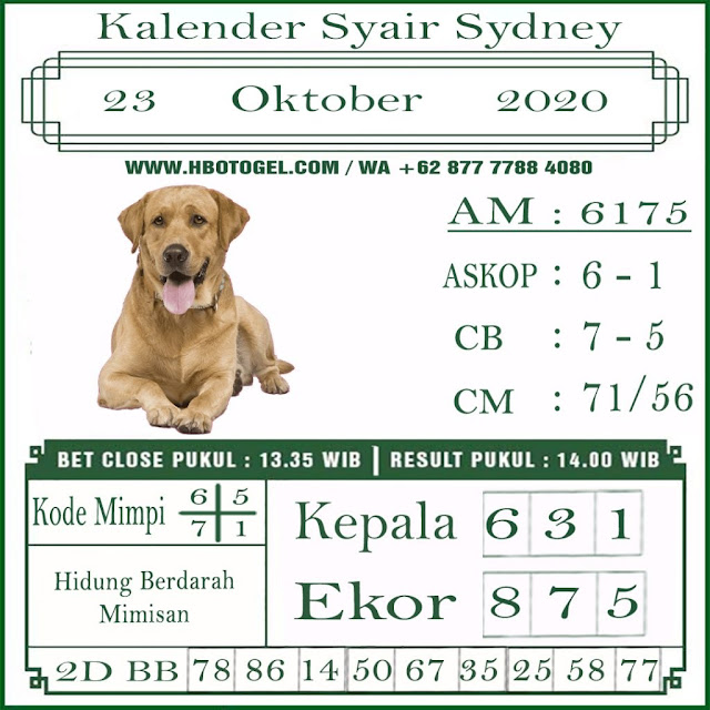 Kode Syair Sdy Jumat 23 Oktober 2020 meliputi forum syair sydney , paito warna sdy serta prediksi togel sidney dan di lengkapi juga dengan data pengeluaran sdy 2020 .