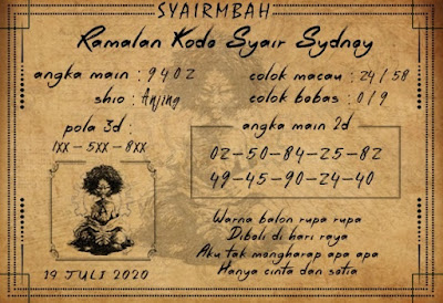 Kode Syair Sdy Minggu 19 Juli 2020 meliputi forum syair sydney , paito warna sdy serta prediksi togel sidney dan di lengkapi juga dengan data pengeluaran sdy 2020 .