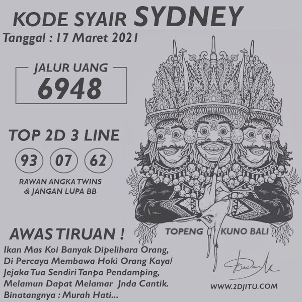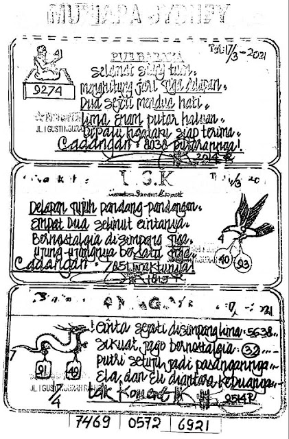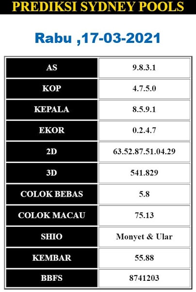 Kode Syair Sdy Rabu 17 Maret 2021, meliputi forum syair sydney , paito warna sdy serta prediksi togel sidney dan di lengkapi juga dengan data pengeluaran sdy 2020 .