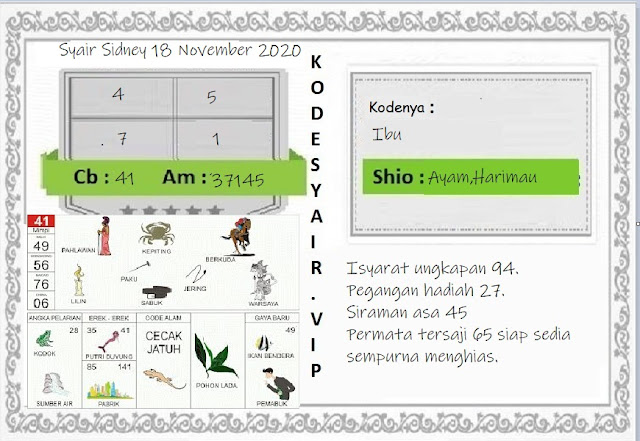 Kode Syair Sdy Syair Sdy Rabu 18 November 2020 meliputi forum syair sydney , paito warna sdy serta prediksi togel sidney dan di lengkapi juga dengan data pengeluaran sdy 2020 .