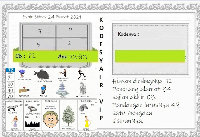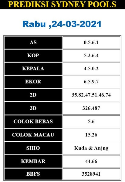 Kode Syair Sdy Rabu 24 Maret 2021, meliputi forum syair sydney , paito warna sdy serta prediksi togel sidney dan di lengkapi juga dengan data pengeluaran sdy 2020 .