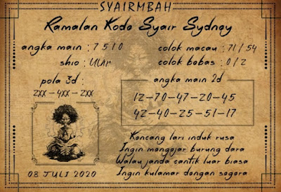 Kode Syair Sdy Rabu 8 Juli 2020 meliputi forum syair sydney , paito warna sdy serta prediksi togel sidney dan di lengkapi juga dengan data pengeluaran sdy 2020 .