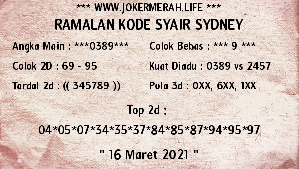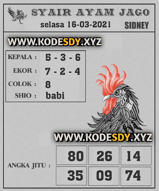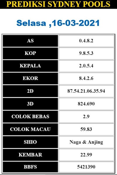 Kode Syair Sdy Selasa 16 Maret 2021, meliputi forum syair sydney , paito warna sdy serta prediksi togel sidney dan di lengkapi juga dengan data pengeluaran sdy 2020 .