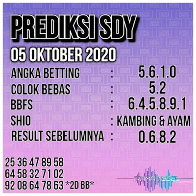 Kode Syair Sdy Senin 05 Oktober 2020 meliputi forum syair sydney , paito warna sdy serta prediksi togel sidney dan di lengkapi juga dengan data pengeluaran sdy 2020 .