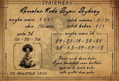 Kode Syair Sdy Senin 3 Agustus 2020 meliputi forum syair sydney , paito warna sdy serta prediksi togel sidney dan di lengkapi juga dengan data pengeluaran sdy 2020 .